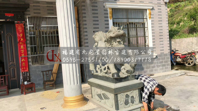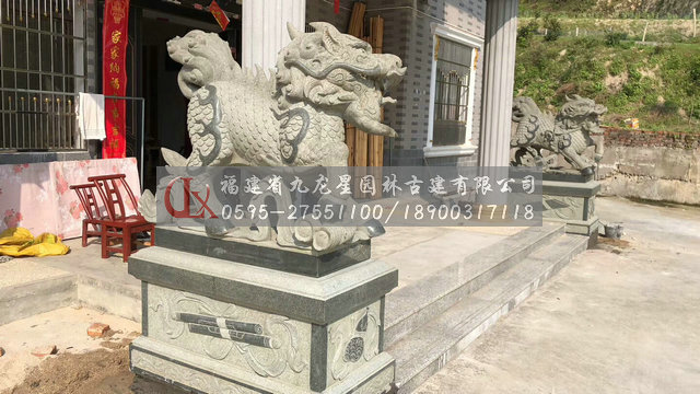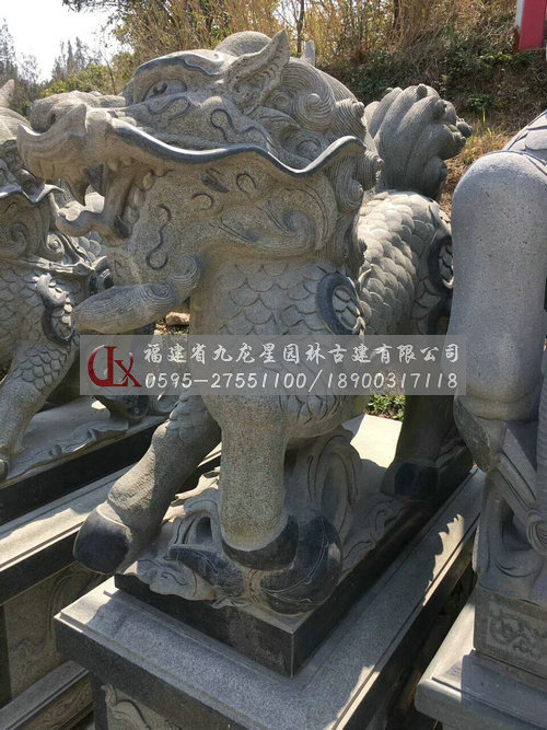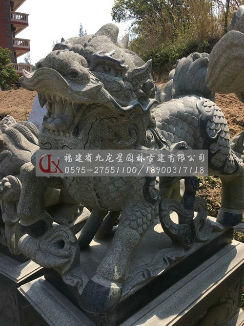 麒麟造型中石刻麒麟多在建筑、皇家建筑里出現(xiàn),其體型巨大,多以威武雄健之態(tài)出現(xiàn)。這說明,麒麟造型的比例尺寸大小是與特定的環(huán)境、風(fēng)俗、情感相聯(lián)系的。石雕麒麟的大也可以解釋為大氣、圣威、權(quán)利,具有震懾的作用。石雕麒麟的造型遵循著傳統(tǒng)文化審美的習(xí)慣,麒麟的造型特征說明其造物意象充滿了對(duì)美好與吉祥的期望。石雕麒麟的整個(gè)造型集龍頭、鹿角、獅眼、虎背、熊腰、蛇鱗、馬蹄、豬尾于一身,另外使用添加手法在下頜處加有長長的胡須,又添加翅膀,這樣,麒麟可以奔跑,可以飛翔,威武之勢(shì)讓人可望不可及。麒麟體現(xiàn)了古人對(duì)現(xiàn)實(shí)世界的主觀理想與造物的主動(dòng)性,其和龍、鳳一樣成了我國傳統(tǒng)民族精神的象征。還有,石雕麒麟的擺放一般是成雙成對(duì)出現(xiàn)的,主要因?yàn)槠湓煨椭v究碩大豐滿,還注重陰陽相守,忌諱殘缺不全、形單影只,其中寄托了人們“天人和諧”的精神追求,內(nèi)涵獨(dú)特而豐富。