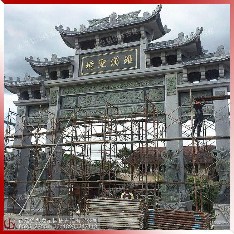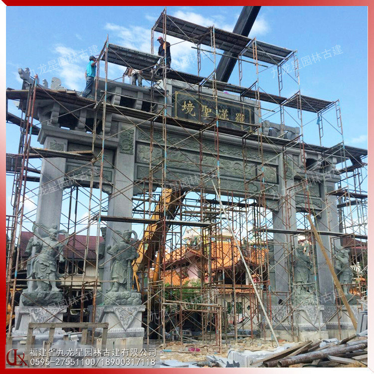 石牌坊定制 牌坊兩側(cè)雕刻護(hù)法神將大型山門石雕